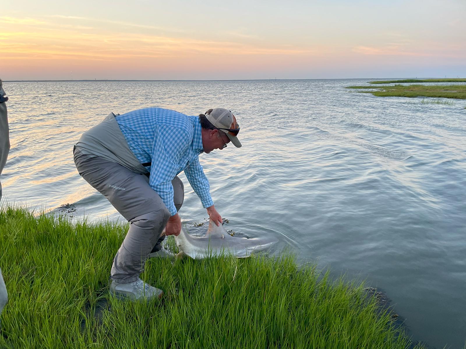 Bill Gordon’s obsession with fishing runs deep—so deep that he follows the shad migration up the U.S. coast each spring, then crosses the country to California to do it all over again. He’s also got a serious soft spot for the heavy metal band Anthrax, with a wardrobe full of tour tees to prove it. But his biggest catch might be what he’s doing now: tagging sharks to help scientists understand one of the East Coast’s most overlooked ecosystems—the salt marsh. Gordon volunteers with Monmouth University researcher Keith Dunton, whose team is studying how sharks use the coastal marshes around Long Beach Island, New Jersey. The goal is to track their movements and understand how these habitats serve as nurseries for juvenile sharks. I joined the team one August night for a round of land-based shark tagging. Fishing for science is my favorite kind of angling—especially when it helps protect the places I love. I’ve helped tag giant trevally on Palmyra Atoll and assisted with trout research in Yellowstone, but I’d never caught a shark. That changed fast. As the sun set, Dunton cast three rods rigged with eel bait and set them in holders. Gordon's line went off first: a smooth dogfish, small but sleek. Dunton’s team moved quickly to measure and tag it. The process involves a small incision in the belly to insert an acoustic tag that emits signals tracked by sensors up and down the East Coast. A second tag goes in the dorsal fin—useful if the shark is ever caught again. The whole process takes minutes, and the shark swims away unharmed. Soon, one of the rods bent hard again. Dunton asked if I wanted a turn. I did—and regretted it immediately. This wasn’t a 12-inch trout. It was a 4-foot sandbar shark, and it had serious pull. My arms and shoulders ached as the dorsal fin sliced through the water. But when we brought it ashore and got it safely tagged, I felt nothing but joy. Dunton handed me a second chance later that night. “You came all the way from Idaho,” he said. “You deserve another shark.” This one was even stronger. I tightened and loosened the drag as Gordon coached me through the fight. For a moment, it felt like just me and the shark, connected by a humming strand of line. The shark, like the first, was tagged and released. Then came the final surprise: something huge took the bait. My colleague Cara Byington gave the rod a few turns before handing it off to me, and I soon realized this wasn’t a shark at all—it was a ray. A big one. A 5-foot-11-inch spiny butterfly ray, to be exact—the largest fish I’ve ever landed. It didn’t jump or run, it just hunkered down and bulldozed. Hauling it in felt like dragging a furious washing machine through wet cement. But we tagged it too, contributing another data point to the ongoing study of this remarkable habitat. Salt marshes are often overlooked, but they’re ecological powerhouses. They buffer coastlines from storms, absorb carbon, and provide shelter for countless species—including sharks. Protecting these ecosystems helps protect both people and wildlife. Dunton’s team has never lost a shark during tagging, which isn’t true for many forms of recreational land-based fishing. Their method is careful and deliberate. It’s also deeply rewarding. “The way you protect sharks is by protecting their home,” Gordon told me. “And that starts with knowing where they go and what they need.” By midnight, most of our group had gone home. I stayed behind, the marsh breeze still cool against my skin, reflecting on what we’d done. Three sharks. One monster ray. A few hours, a few data tags—but a lot of meaning. Next time you drive past one of those quiet, reedy bays on your way to the beach, take a second look. There are sharks in there. And people working to protect them.