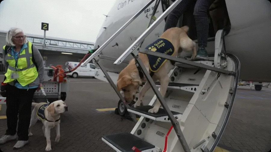 Guide dog puppies are getting a unique training experience at Southampton Airport in Hampshire. The charity Guide Dogs held its first-ever airport training session, aiming to familiarize the puppies with the bustling environment they might encounter later as working guide dogs. The young pups toured various parts of the airport, including the baggage carousel, duty-free shops, and departure lounges. They were accompanied by their puppy raisers, who ensured they remained calm and focused amid potential distractions. Morris Boyle, operations director at Southampton Airport, expressed interest in making these training sessions a regular feature. One of the participants, six-month-old Lee, was among seven puppies attending this session during a quieter time at the airport. The experience offered fresh challenges for the pups. Simon Wallenburg, a puppy raiser, noted that navigating airplane stairs was particularly new for them compared to what they're accustomed to in places like Westquay Shopping Centre in Southampton. "They've never ever come across stairs like this before," Wallenburg said, emphasizing how beneficial it was for their training. Puppy raisers play an essential role in preparing these dogs for their future duties. Volunteers care for puppies from six to eight weeks old until they are ready for formal training with Guide Dog staff. During this period, they help with basic training and socialization while introducing them to new environments and experiences. Sharon Wallenberg, another dedicated puppy raiser, finds this process "very rewarding." She explained that exposing the dogs to different sights and sounds is crucial because "in his future life," a guide dog might accompany its owner on flights. This kind of exposure helps build familiarity and confidence in such environments. Leanne Kelley from Guide Dogs highlighted the importance of this exposure: "It's sometimes nice just to pause and for the dogs just to learn to relax in that environment." She pointed out that achieving relaxation can be challenging when dealing with lively, playful pups. The day concluded as a positive experience for everyone involved—humans and canines alike—with many considering it a valuable step in preparing these puppies for their future roles as guide dogs.