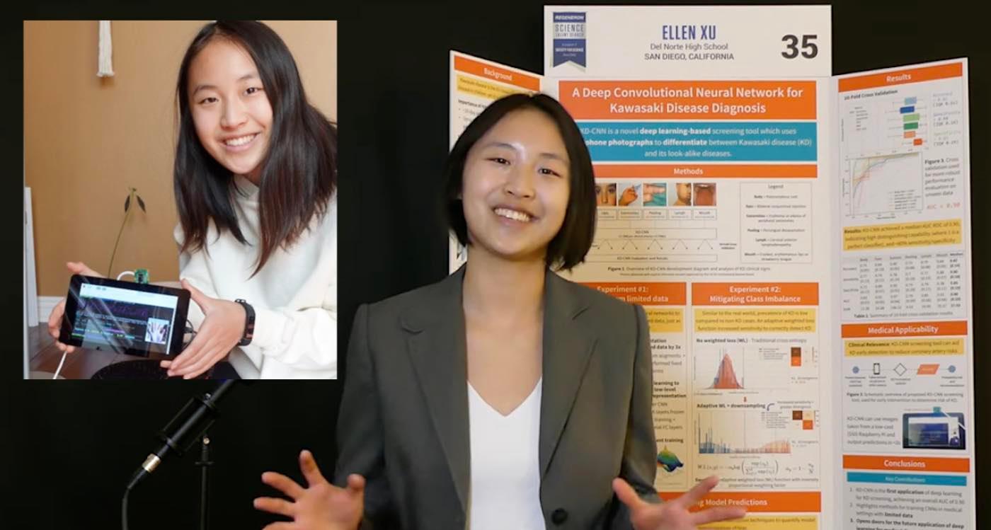 Ellen Xu, a 17-year-old student, has won third place and a $150,000 reward in the Regeneron Science Talent Search competition for developing an AI-based diagnostic test for Kawasaki disease. With Kawasaki having no existing test method and children risking long-term heart complications if left undiagnosed, Xu took it upon herself to use deep learning and crowdsourcing to create an 85% positive diagnosis rate using just a smartphone image. The disease currently has no existing test method, making Xu's test a significant breakthrough.