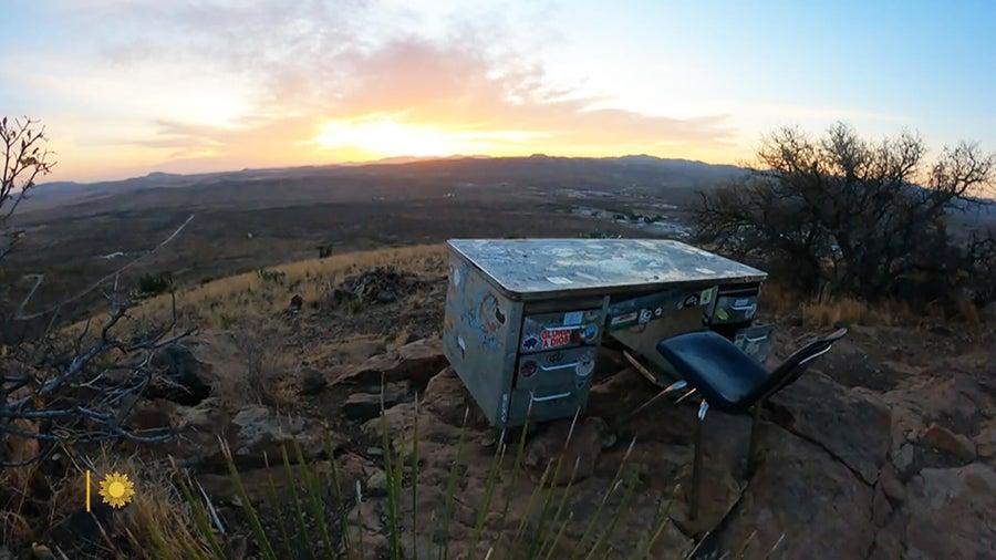 In the high desert of West Texas, a battered school desk sits at the top of Hancock Hill. No signs point the way. There are no guideposts or plaques. But for nearly five decades, people have found their way up the dusty trail near Alpine, drawn to a place that has quietly become a local legend. The desk, overlooking the town of Alpine and the surrounding desert, was first hauled up in the late 1970s by Sul Ross State University student Jim Kitchen and a few classmates. They were simply looking for a quiet place to study—with a view. “He’s the kind of guy who would drag a desk to the top of a hill,” said his nephew, Tony Curry. “He’s a wild, wild man and he’s got a lot of energy.” Since then, the desk has weathered the elements, been replaced every decade or so, and become a pilgrimage site of sorts for hikers, writers, and the curious. Beside the desk sits a notebook and pen, inviting visitors to write whatever’s on their minds. Tony Curry has written in the book many times. “It’s kind of like a meditative place,” he said. “You can just think about things and sort out your problems.” Dozens of filled notebooks—some dating back decades—are archived in the university library. Paula Kitchen Curry, Jim’s sister, has made more than 30 trips up the hill to rotate out the journals and preserve them. “What I bring back is something like a confession booth wrapped in a time capsule,” she said. The entries range from lighthearted to gut-wrenching. One message reads: “To 18 y/o me & everyone who needs to hear it: It does get better. Change can be good. The world is bigger than you think it is.” “Sometimes it breaks my heart,” Paula said. “Sometimes it makes me laugh. Sometimes it makes me want to be a better writer.” Amateur photographer Matt Walter first discovered the desk in 1986 and has returned often to document it. “You reflect on the views, the distance, looking out onto this vastness, and wonder about the amazement of Mother Nature,” he said. For visitors like Dani Bell, the experience is therapeutic. “You can clear your mind and really just get some stuff out if you need to,” she said. What began as a college student’s creative study spot has become something more—an unlikely desert sanctuary where people hike up full of thoughts and walk back down a little lighter.