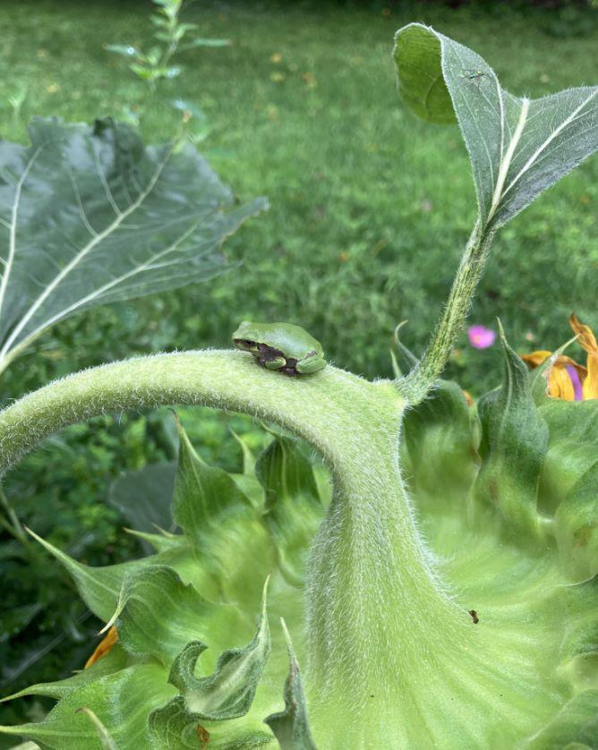 When you venture into gardening with native plants, you might find all sorts of interesting interactions between flora and fauna. One Reddit user stumbled upon a small frog perched on a giant sunflower head in their garden and humorously commented, "My depressed sunflower has an emotional support frog," on the r/Gardening subreddit. While the sentiment was amusing, it turns out the sunflower was likely just fine. A commenter pointed out that "sunflower heads turn down to prevent water and sun damage once the seeds are pollinated." So, it seems this is quite normal for healthy sunflowers. Sunflowers are a fantastic choice for anyone looking to incorporate native plants into their garden. According to the U.S. Forest Service, over 50 species of sunflowers are native to North America and Mexico. These vibrant flowers can boost your yard's biodiversity significantly while being low-maintenance. Sunflowers are annuals that reseed themselves each year and attract bees, beetles, butterflies, finches, and small mammals. Frogs are another welcome addition to any healthy garden. They serve as both predator and prey in their ecosystems and help control insect populations while also providing food for larger amphibians. While frogs don't have a formal symbiotic relationship with sunflowers, they might choose to sit on these tall plants to snack on leaf-eating beetles. This not only benefits the frog but also helps protect the sunflower from pests. Moreover, frogs use vegetation like sunflowers to regulate their body temperatures since they are ectothermic or cold-blooded creatures. The combination of sunbathing platforms and cooling shade provided by plants like sunflowers is essential for them. Frogs play an important role as indicator species in ecosystems because they reflect biodiversity levels. Incorporating native plants into your yard is one way to promote biodiversity effectively. Rewilding your space by planting local species can save money on landscaping while improving air and soil quality. Native plants thrive best where they've naturally evolved over thousands of years due to specific soil compositions, temperatures, sunlight exposure, and local pollinators. This makes them low-maintenance options since they require minimal additional resources beyond what nature already provides in those regions. Rewilding efforts can lead to stunning results by using techniques such as xeriscaping or replacing traditional grass lawns with wildflower fields or natural grasses like clover or buffalo grass. For more tips on helping yourself while benefiting the planet simultaneously, consider subscribing to newsletters that offer good news along with useful advice for sustainable living practices at home and beyond.
